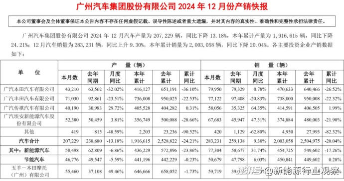 广汽集团总销量200.3万辆,同比下滑20.04%,除广汽传祺有1.99%的同比微涨外,旗下子品牌和合资品牌均呈下滑态势;总营收为1077.8亿元,同比下滑16.9%,归母净利润为8.24亿元,同比下滑81.4%。