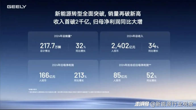 在这之中,也有部分车企的市场情况相对乐观,比如吉利去年总销量为217万辆,同比增长32%;总营收为2401.9亿元,同比增长34%,归母净利润为166亿元,同比增长213%。比亚迪总销量为427万辆,同比增长41%;总营收为7771亿元,同比增长29%,归母净利润为402.5亿元,同比增长34%。