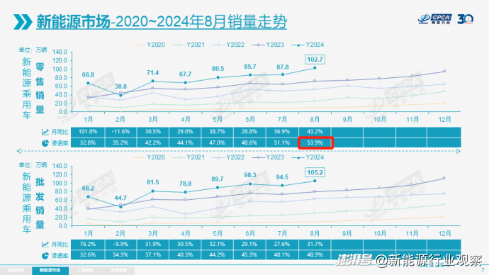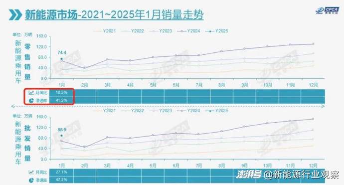 从市场现状来看,随着新能源市场的发展,市场需求似乎渐显饱和态势。国内新能源零售渗透率在去年8月到达53.9%的高点后,开始回落,今年1月更是跌至41.5%,近两个月出现回温,基本稳定在51%左右。