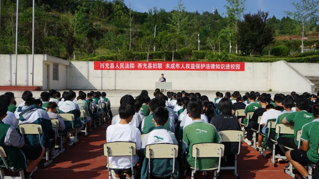 5月26日,西充县人民法院联动县妇联,走进四川省西充中学临江校区,为初中一、二年级的同学们带来了一场《中华人民共和国未成年人保护法》法律知识大讲堂。学生们利用大课间,有序来到操场,刑事审判庭员额法官袁媛从真实案例入手,用中学生们感兴趣的话题进行互动问答,向同学们普及《未成年人保护法》的相关知识,着重地讲解到校园欺凌、性侵害和未成年人沉迷网络等问题,教同学们如何利用法律保护自己、在遭遇此类问题后如何向相关人员寻求帮助。