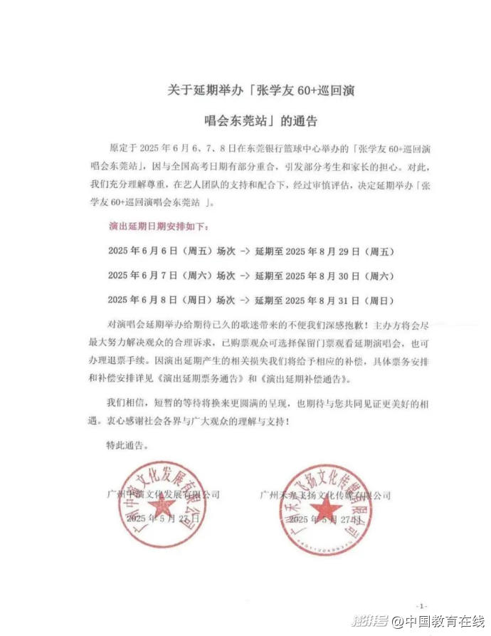 5月27日晚,“张学友60+巡回演唱会东莞站”主办方发出延期通告称,原定于2025年6月6日至8日举办的演唱会,延期至8月29日至31日举办。演唱会延期票务通告和补偿通告已同步发布。