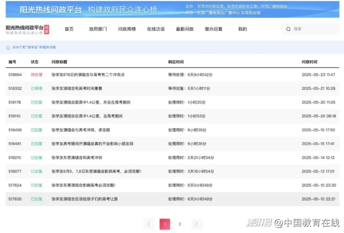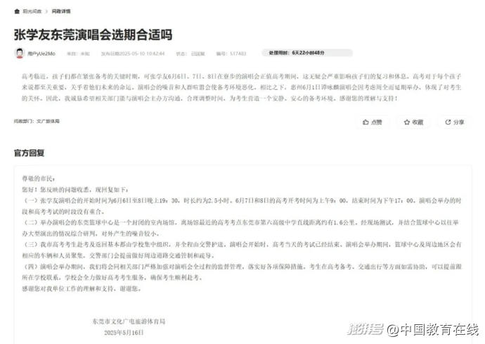 对于上述投诉,东莞市文化广电旅游体育局回复称:演唱会举办的时段和高考考试的时段没有重合;举办演唱会的东莞篮球中心是一个封闭的室内场馆,离场馆最近的高考考点东莞市第六高级中学直线距离约有1.6公里。经现场测试,并结合篮球中心以往举办大型演出的情况综合研判,对外产生的噪音较小。