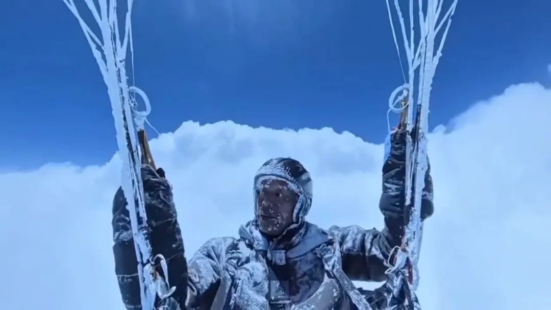 彭先生随身的视频记录显示,对流云里的水汽在他的脸上、身上和装备上结起一层冰霜。手套的拉链没有拉紧,他用冻僵的手努力控制滑翔伞,朝着伙伴在对讲机里提示的北方飞。彭先生说,在云里还是比较乱的,很难完全保持在指南针指定方向,但还是勉强沿着东北方向飞出来了。一出云就赶紧通报“总算出云了”,通报完以后一路向东北方向飞到祁丰藏族乡的天生场降落了。
