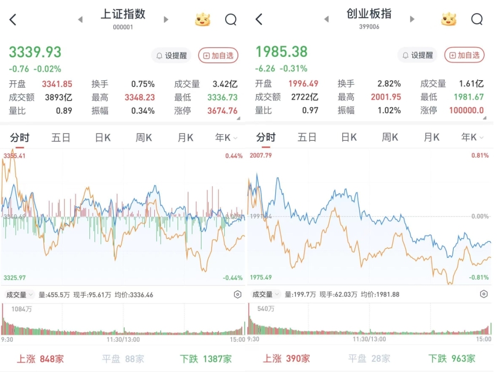 至收盘,上证综指跌0.02%,报3339.93点;科创50指数跌0.23%,报970.64点;深证成指跌0.26%,报10003.27点;创业板指跌0.31%,报1985.38点。