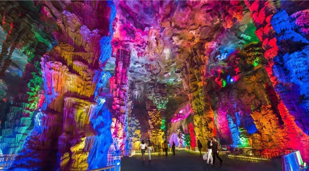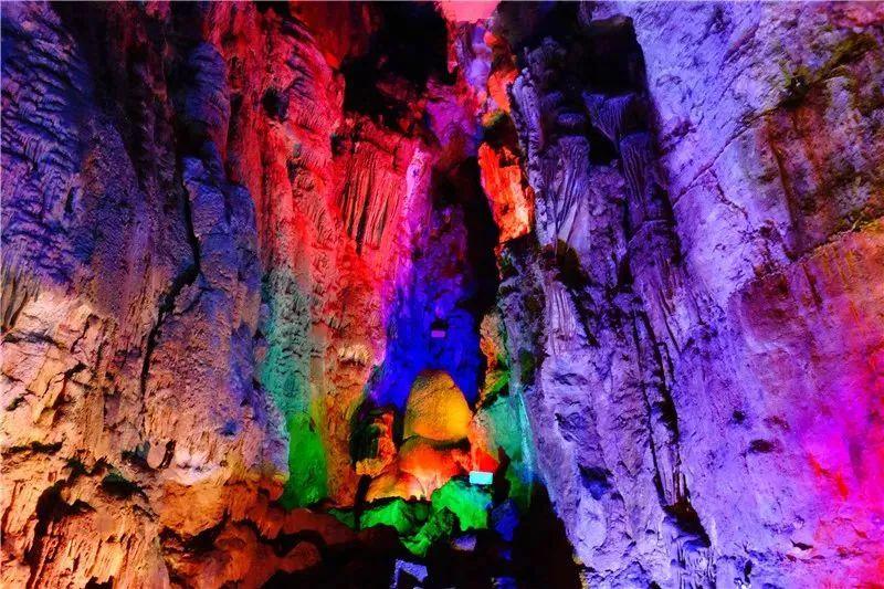 全长1280米的溶洞内,千姿百态的石笋、石柱、石幔如鬼斧神工,唐代摩崖石刻诉说着历史沧桑,更有“珍珠滩”“龙脊厅”等奇景,在灯光映衬下如梦似幻。