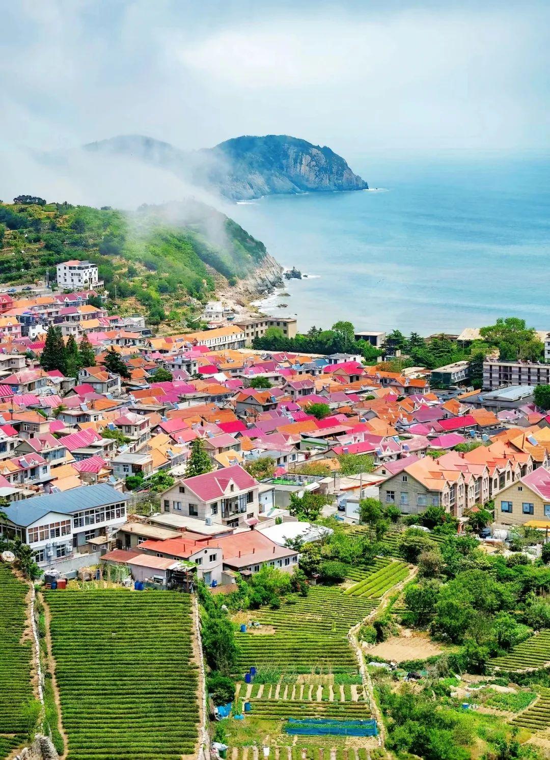 它深藏在远离市区的崂山南线深处,三面环山,一面临海,红瓦石墙的民屋错落有致,梯田茶园层叠铺展,碧波渔船点缀海湾,在雾气流动之下,宛如一幅流动的水墨丹青画。