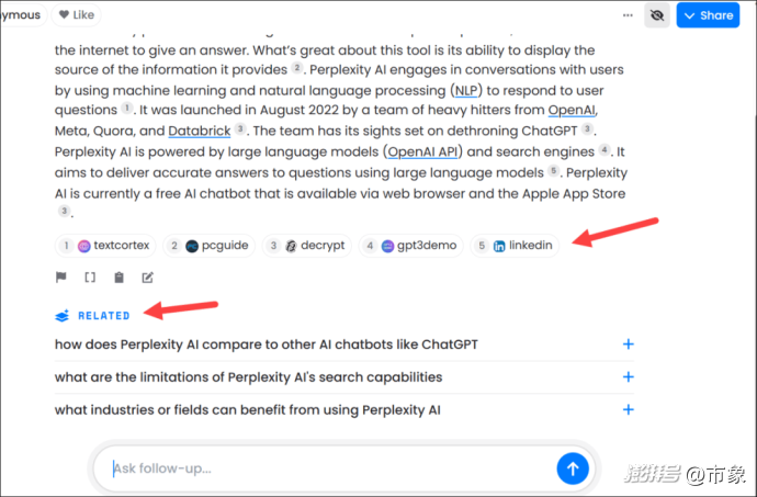 Perplexity还有另一个显著特点,它支持连续追问,有点像“AI问答社区”。Perplexity创始团队有来自美版知乎Quora的成员,使用Perplexity时你可以一问再问,它会“记住你前一个问题”,在上下文里逐步深入。不像传统搜索,每次都是“一问一搜”,用户得自己整合答案。