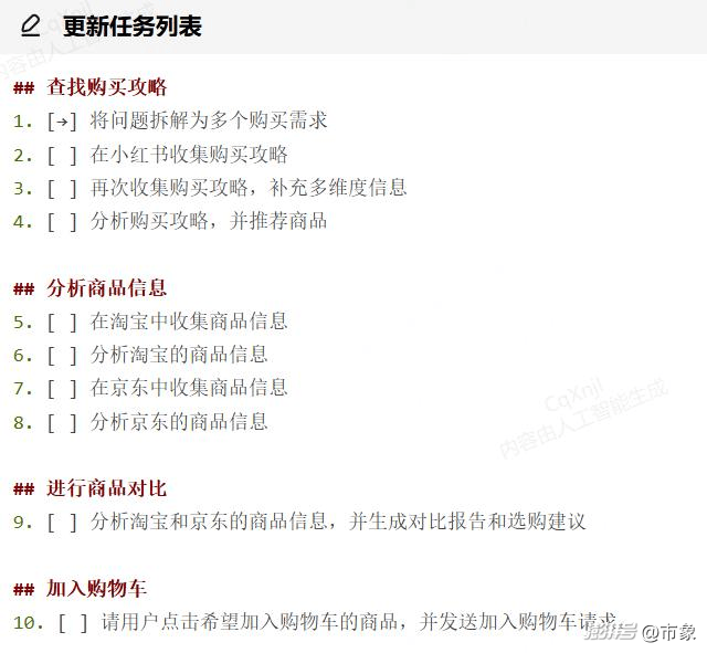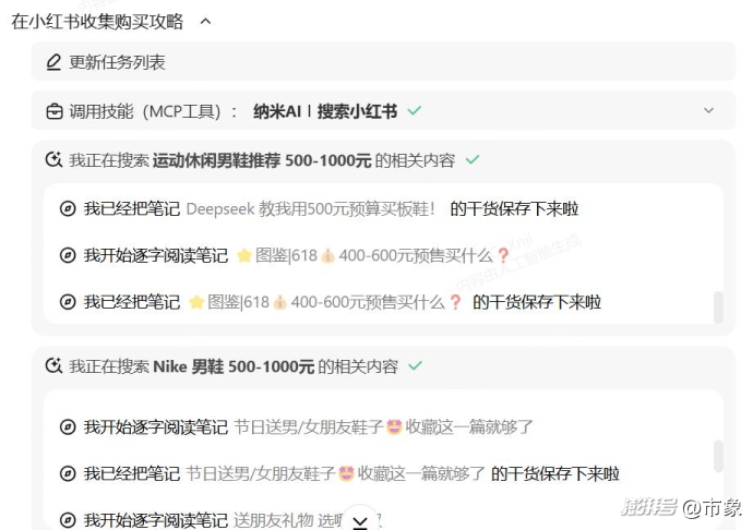 每个子任务单独进行信息搜索和MCP工具调用,比如在小红书收集各个品牌的购买攻略。