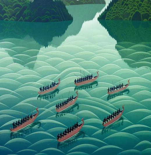 赏析:“竞渡”就是现在赛龙舟活动的前身。为了衡量竞渡的胜负,唐人创造了“锦标”的比赛制度,指在龙舟划到终点的时候,以抢夺浮标来判断胜负,抢得头标的人就是比赛的冠军,鼓声擂动,船只齐发,争先恐后,惊吓得水鸟乱飞,只为夺得锦标。