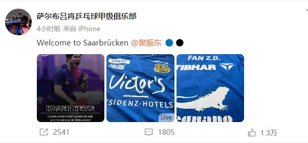 德甲联赛萨尔布吕肯乒乓球甲级俱乐部宣布,奥运冠军樊振东加盟。