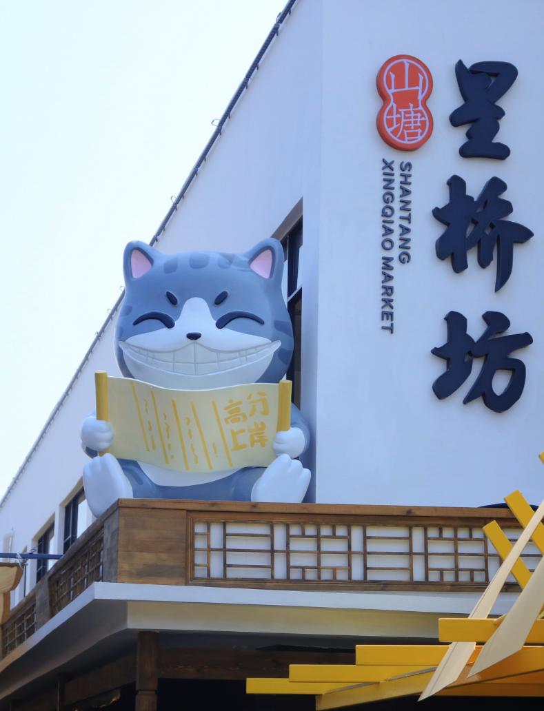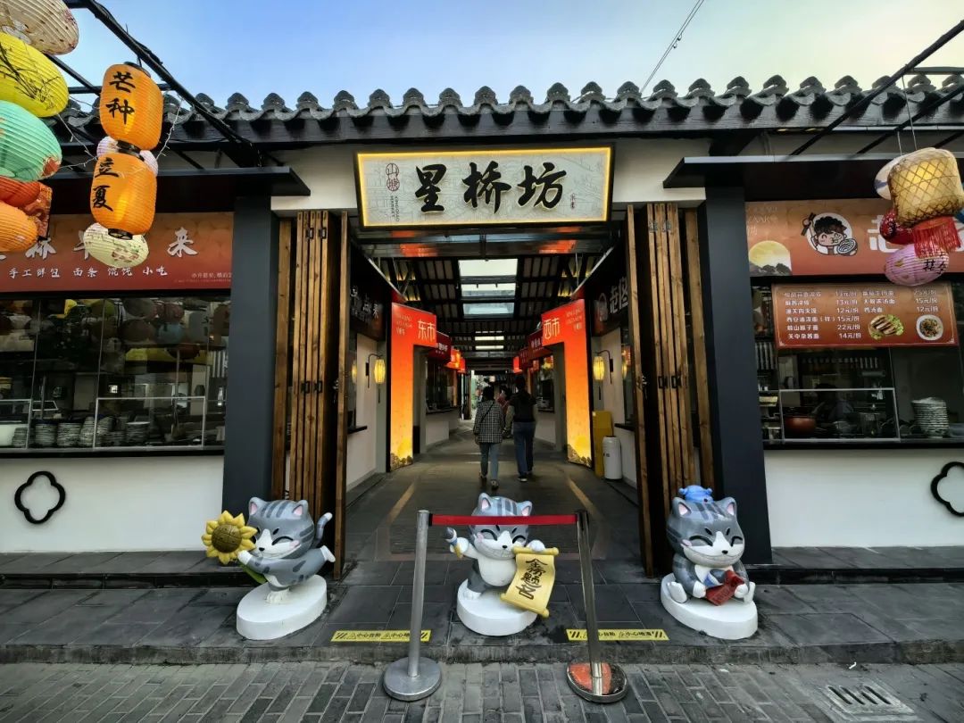 距星桥坊几步之遥的文星狸静踞山塘河畔,作为学识智慧的象征。星桥坊将狸猫元素转化为可交互的文化IP,同步打造主题装置,“金榜题名”等标语格外醒目,狸猫雕像分布于各处,随便一拍就很出片。