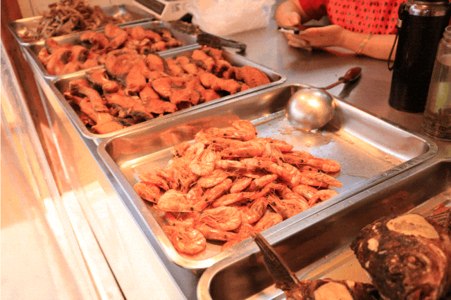 跟隔壁摊位端着一碗菜肉馄饨的朋友