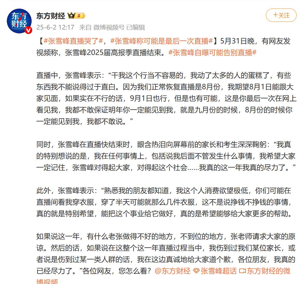 原标题:《张雪峰含泪道歉!“可能最后一次在网上出现”》