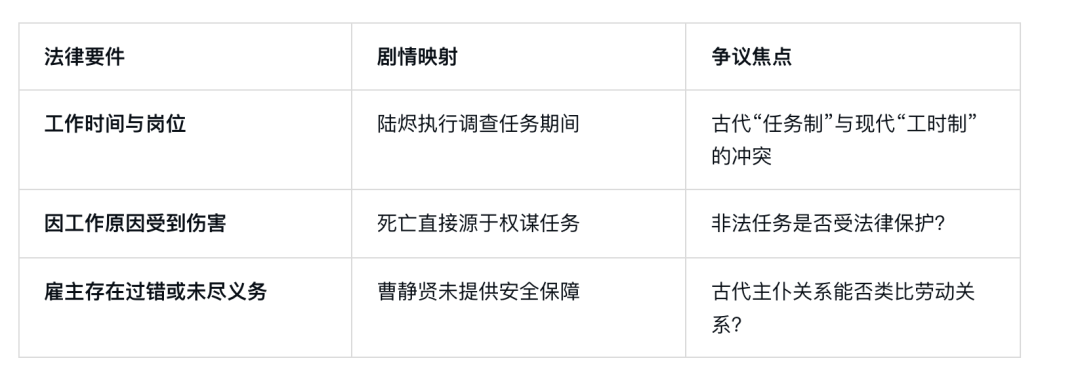 另外,陆烬是曹静贤养子,并不存在劳动关系,陆烬的本质是权力斗争中的“工具人”。剧中明确揭示,他武功高强,除了保护曹静贤,肯定也做一些不法事情,而这些事没有从现代角度看,没有一件事不危险的,可以说是“以生命为代价完成KPI”的设定,这方面与现代职场中因过度加班、高危作业导致伤亡的情形形成隐秘呼应。