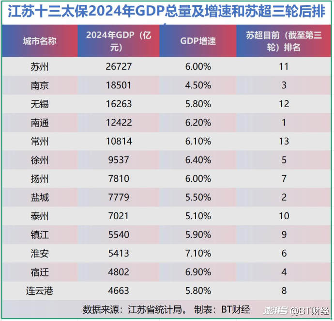 附:江苏十三太保2024年GDP和目前苏超排名表。