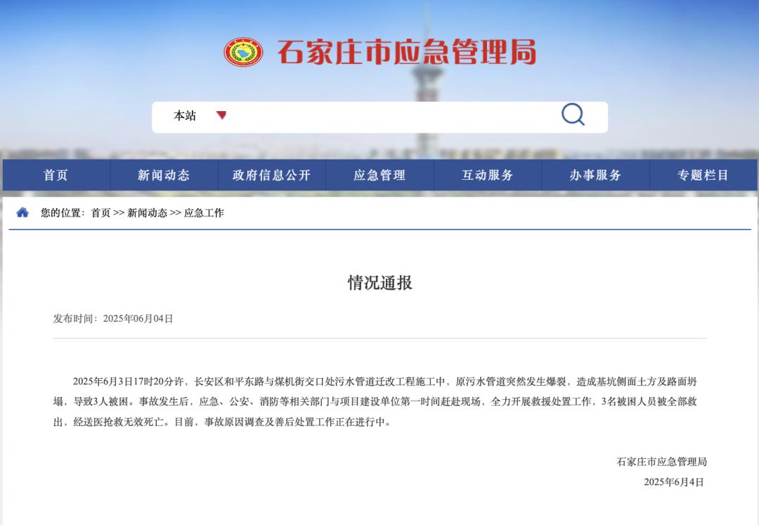 据河北石家庄市应急管理局通报:6月3日17时20分许,长安区和平东路与煤机街交口处污水管道迁改工程施工中,原污水管道突然发生爆裂,造成基坑侧面土方及路面坍塌,导致3人被困。事故发生后,应急、公安、消防等相关部门与项目建设单位第一时间赶赴现场,全力开展救援处置工作,3名被困人员被全部救出,经送医抢救无效死亡。目前,事故原因调查及善后处置工作正在进行中。