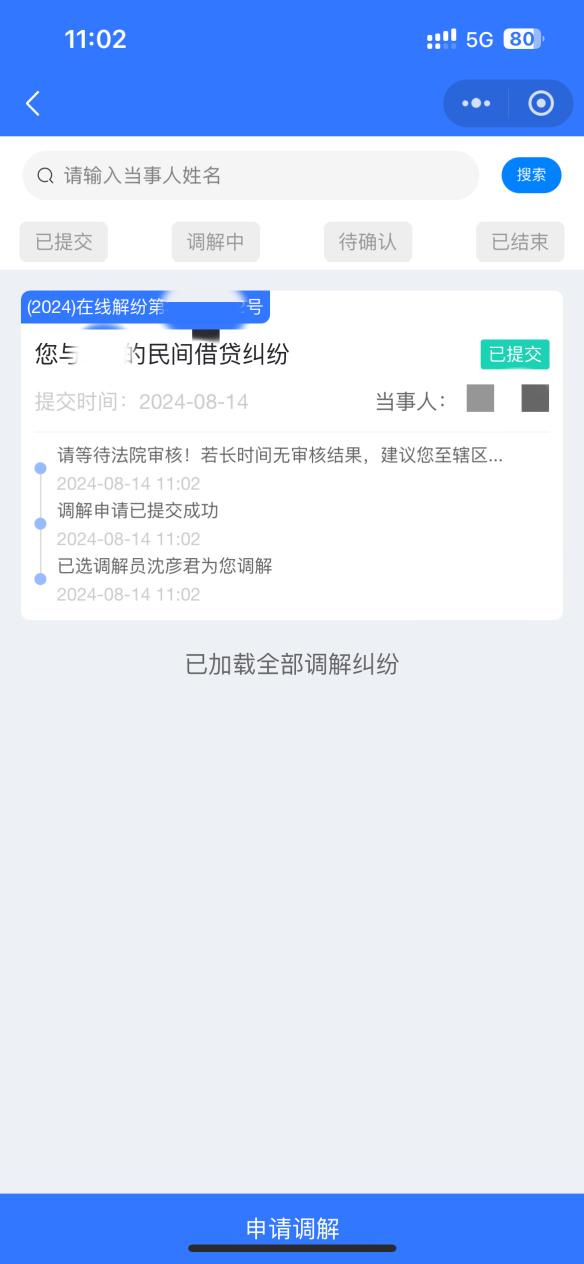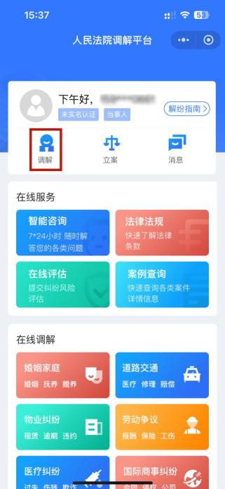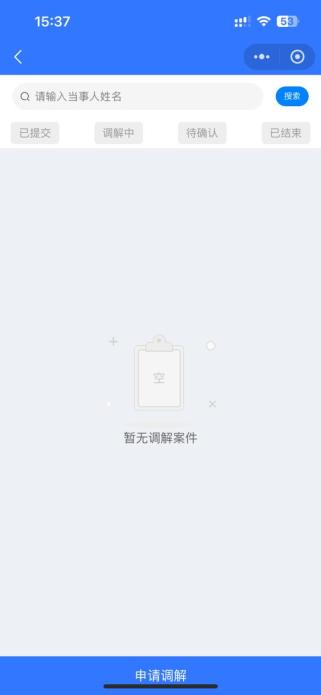 3登录后,在首页,点击调解,进入调解模块,在底部点击“申请调解”。