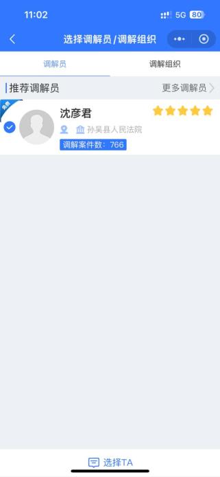 5申请人需要填写“送达地址确认信息”,选择通过何种方式接受诉讼文书。点击“保存”后进入下一界面,选择“调解员”。