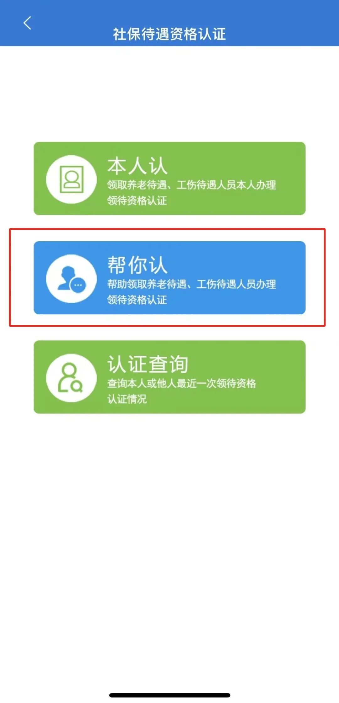 如果您不会使用智能手机,可由他人协助,用他人的手机和账号登录“重庆人社”APP,使用“社保待遇资格认证”中的“帮你认”功能,在家人、亲朋好友、邻居、志愿者、社保经办机构工作人员、村社工作人员,以及社银、社联、社邮合作网点的工作人员帮助下进行刷脸认证。
