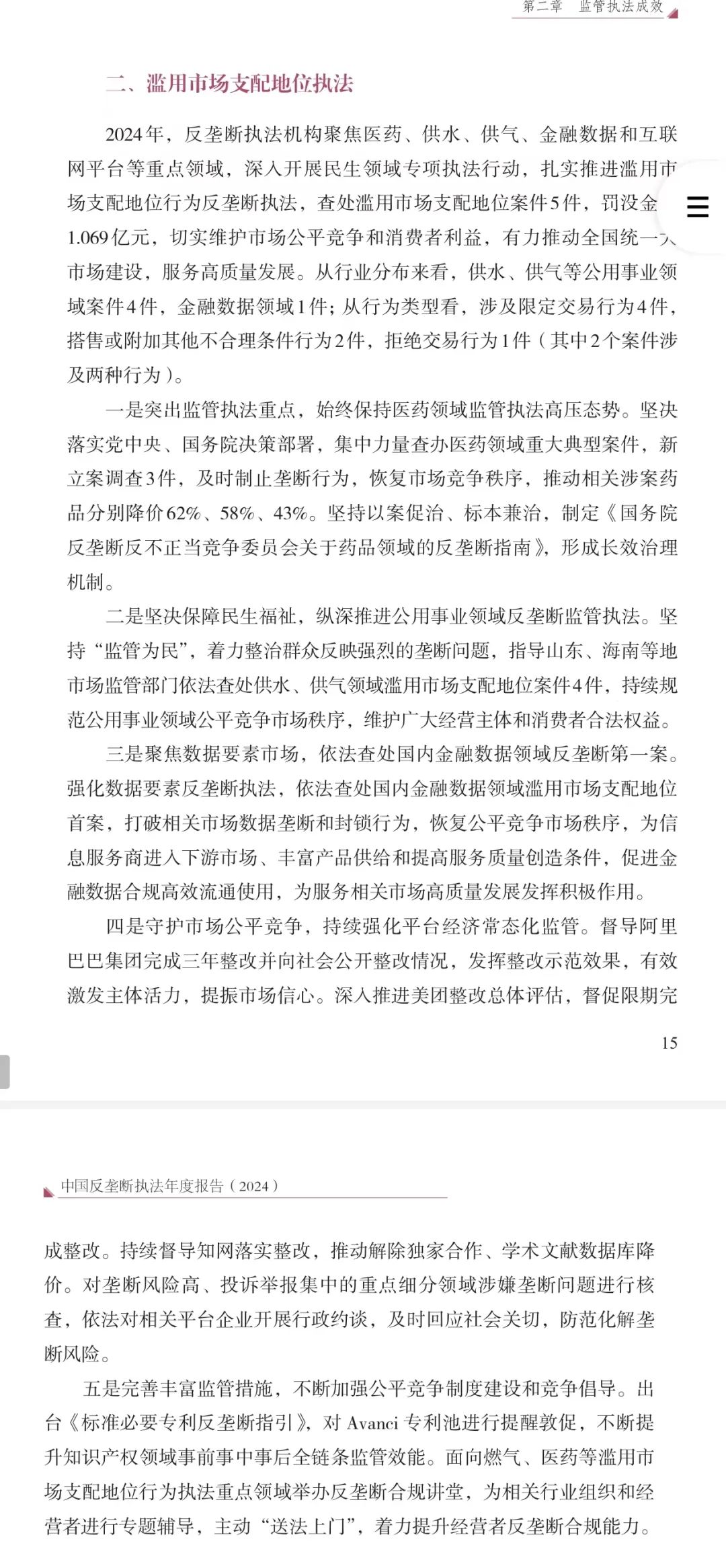 报告提到,2024年,反垄断执法机构聚焦医药、供水、供气、金融数据和互联网平台等重点领域,深入开展民生领域专项执法行动,扎实推进滥用市场支配地位行为反垄断执法,查处滥用市场支配地位案件5件,罚没金额1.069亿元,切实维护市场公平竞争和消费者利益,有力推动全国统一大市场建设,服务高质量发展。从行业分布来看,供水、供气等公用事业领域案件4件,金融数据领域1件;从行为类型看,涉及限定交易行为4件,搭售或附加其他不合理条件行为2件,拒绝交易行为1件(其中2个案件涉及两种行为)。一是突出监管执法重点,始终保持医药领域监管执法高压态势。坚决落实党中央、国务院决策部署,集中力量查办医药领域重大典型案件,新立案调查3件,及时制止垄断行为,恢复市场竞争秩序,推动相关涉案药品分别降价62%、58%、43%。坚持以案促治、标本兼治,制定《国务院反垄断反不正当竞争委员会关于药品领域的反垄断指南》,形成长效治理机制。