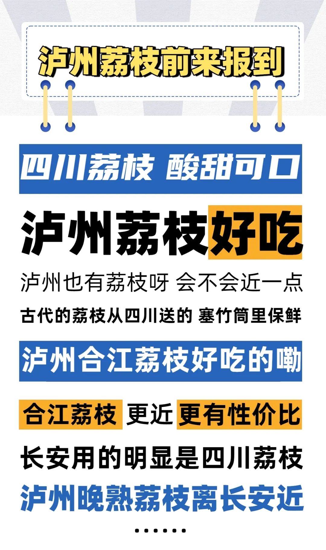 网友发布的实时弹幕。合江荔枝产自泸州市合江县,是中国国家地理标志产品。合江作为四川最重要的荔枝产地,栽种荔枝的年代比唐朝更早。南北朝竺枝所著《扶南记》记载:“荔枝始传于汉世,初惟出岭南,后出蜀中。”时间再往前,《华阳国志》中记载如僰道“有荔枝、姜、蒟”,江阳“有荔枝、巴菽、桃枝、蒟、给橙”。可见,东晋常璩著此书时,蜀地荔枝已遍地开花。