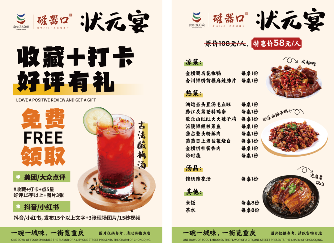 ✅购买小吃宴/状元宴,现场可领取“磁器口卡券”,到以下任意店铺消费享受8.5折(林耍耍老火锅凭学生证8折优惠)。