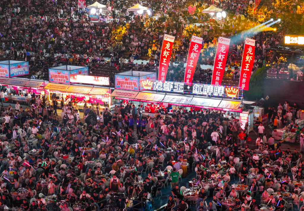 夜幕渐深,夏风里裹着龙虾香。据悉,“欢乐龙虾宴”将持续3天,已售出票3万张,预计销售龙虾约100吨。以虾为媒,盱眙正以最真诚的方式,让每一个来的人,都能带着满足与开心,记住这座城市的温度。