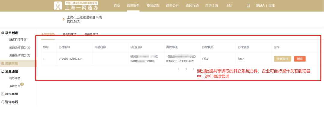 (2) 关联事项:系统通过数据对接,从“一网通办”等共享渠道,调取外系统已经办理的事项,企业可自行将事项关联到项目中,方便企业通过项目维度对事项进行管理。目前,系统已可归集发改、规划、住建、绿化、水务等各部门与工程建设项目审批相关的约90个事项。