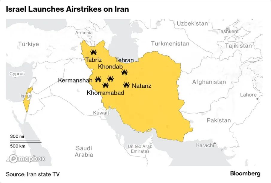 以色列13日凌晨开始的空袭所打击的伊朗境内地点 彭博社制图