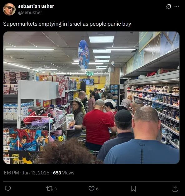 以色列政治学家奥里·戈德堡(Ori Goldberg)告诉卡塔尔半岛电视台,以色列政府警告民众储备两周所需的生活必需品,这让以色列一些超市出现恐慌性抢购现象。