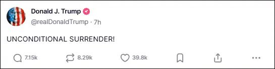 当天下午,特朗普用全大写字母呼吁伊朗“无条件投降!”。