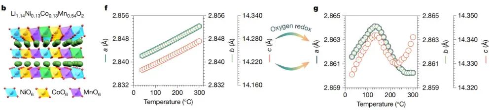 富锂锰基材料在电化学激活前后的晶格参数随温度变化图 电化学激活前(图f),材料的晶格参数随温度升高而变大,即材料发生正热膨胀;电化学激活后(图g),材料的晶格参数随温度升高先变大后变小,即材料先发生正热膨胀,随后发生负热膨胀。(晶格参数:晶体物质的基本结构参数,晶胞的物理尺寸)图片来源:参考文献[1]这种负热膨胀是如何产生的呢?