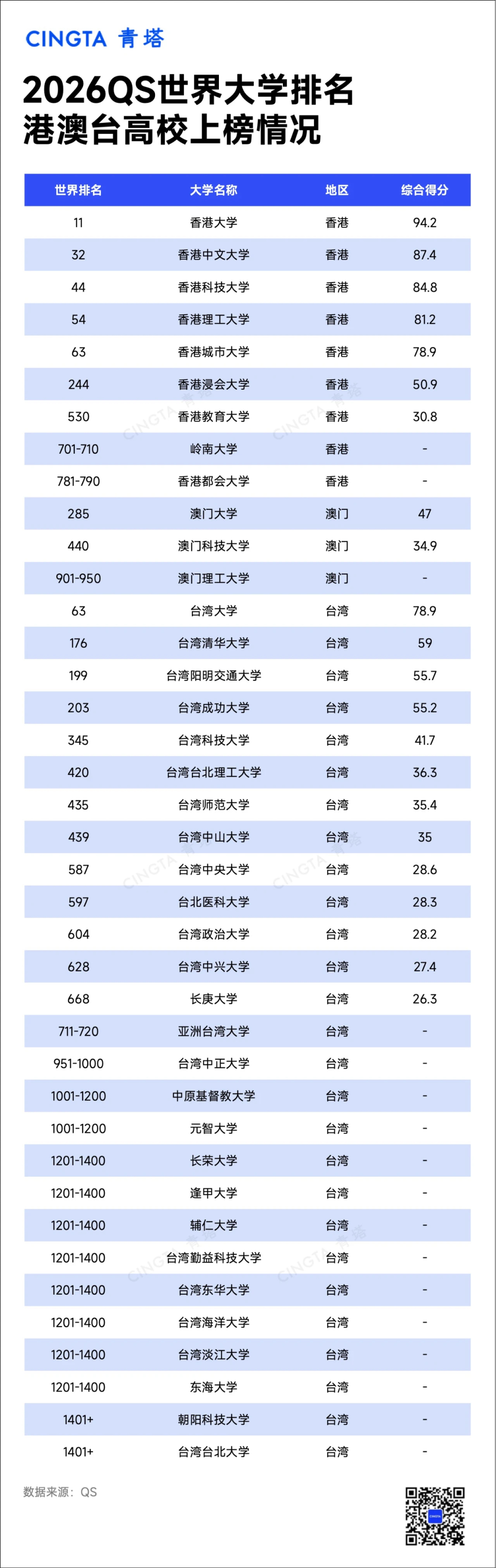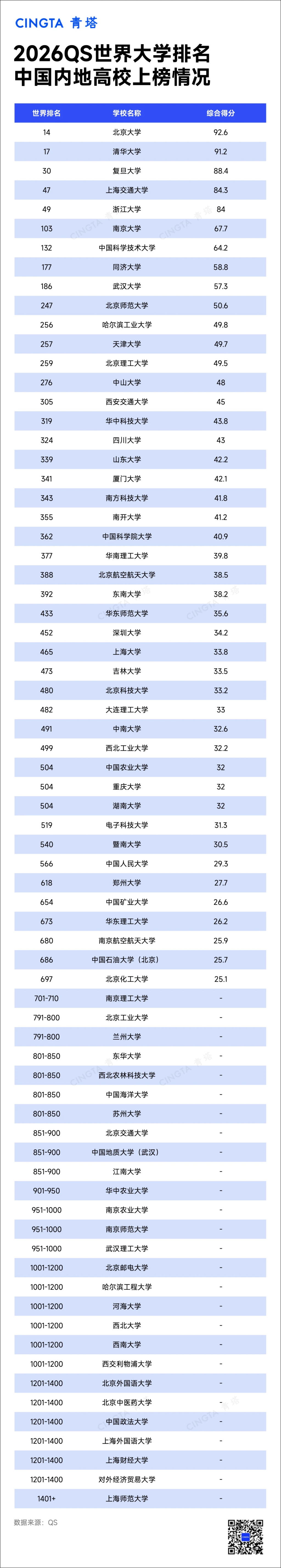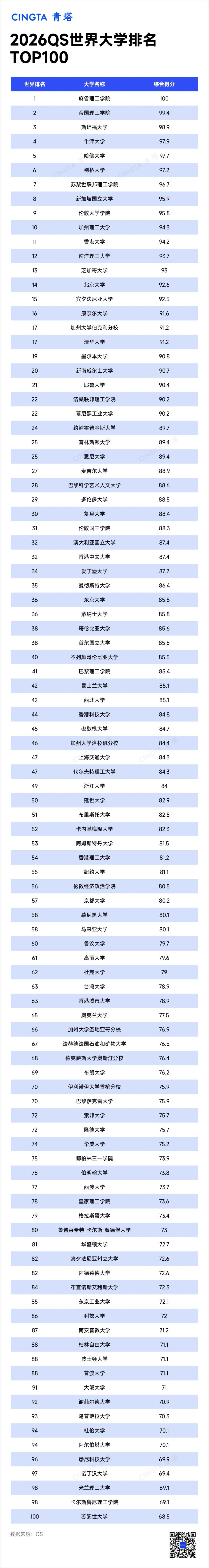 关注【青塔】公众号,对话框回复【QS】,获取2026世界大学排名完整名单、详细得分。