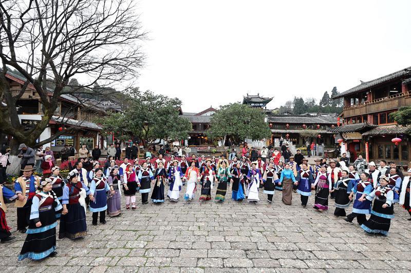 丽江古城各民族群众在一起载歌载舞。陈飞 摄