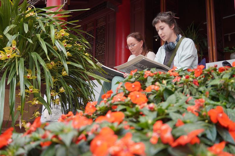 木府回廊光影斑驳,俄罗斯游客斯维塔撑起画板,淡蓝的眸子凝视着眼前花朵。书本上的丽江化为亲见的惊喜,她已计划好下一次丽江之行,画笔游走间,清丽的兰花浮现纸面。