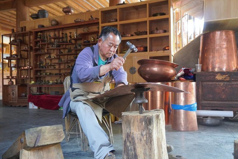 白沙打铜技艺 李铁成 摄她指向阳光下光彩熠熠的“忠义”匾额:“这是明神宗万历皇帝钦赐。府内还珍藏着‘诚心报国’‘辑宁边境’等11块历代皇帝所赐匾额,见证木氏土司忠诚中央政府,维护边疆之史。”