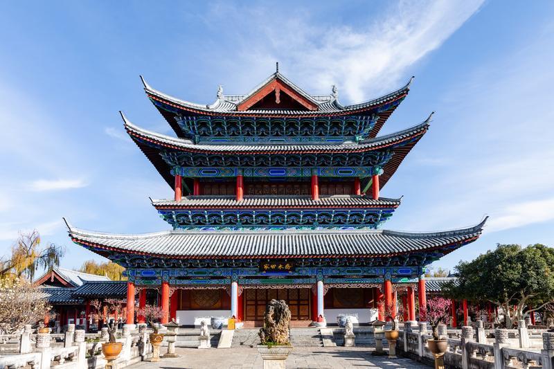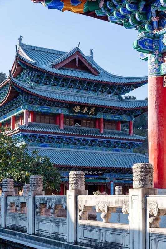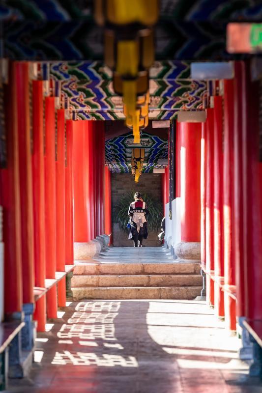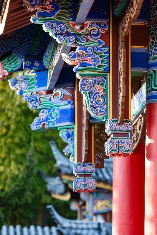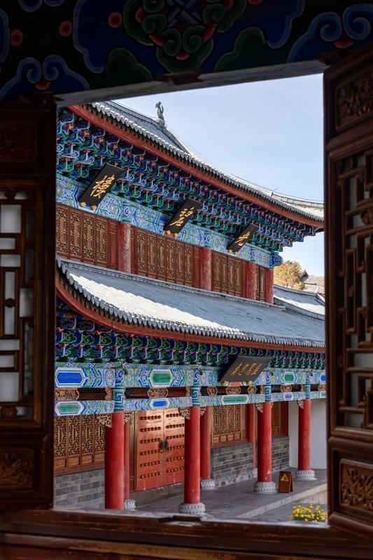 踏入朱红色大门,议事厅、万卷楼、护法殿沿中轴线庄严列阵,印证徐霞客“宫室之丽 拟于王者”之叹。行走其间细细端详,梁枋间精美的彩绘木雕留存着汉地、各民族工匠与画师的合作笔触。“形制守中原,细部存纳西”的营造智慧,让中华民族“各美其美,美美与共”的价值取向在西南边陲具象呈现。