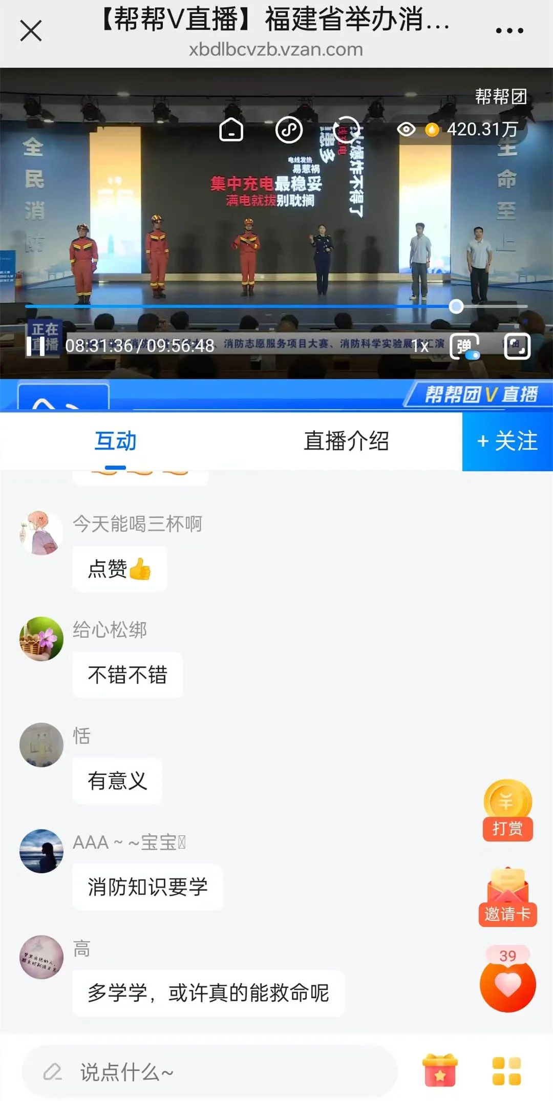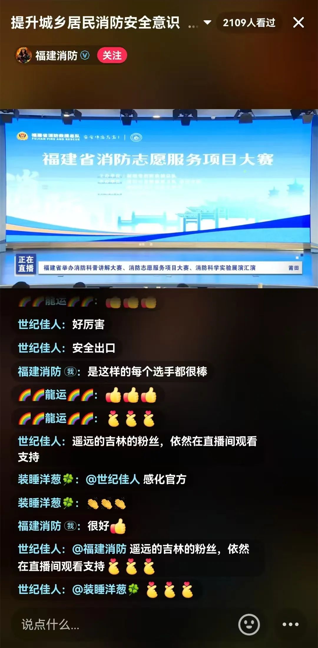 在消防志愿服务项目大赛中,各个消防志愿服务团队的选手代表阐述了近几年在活动中取得的成效和感人故事。“消防安全就在每一个人身边,是社会各界共同的责任!”“看完防火门对比实验,才知道原来一扇防火门有这么多秘密,有些门关上了才真保命!”此次比赛也进行了同步直播,网友跟随直播镜头纷纷有感而发。