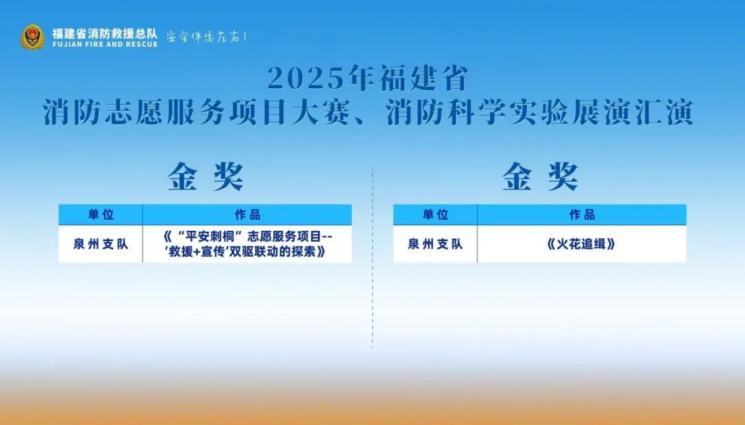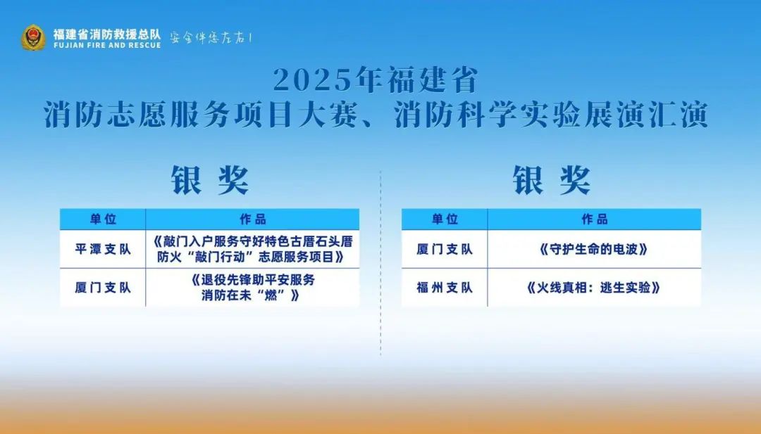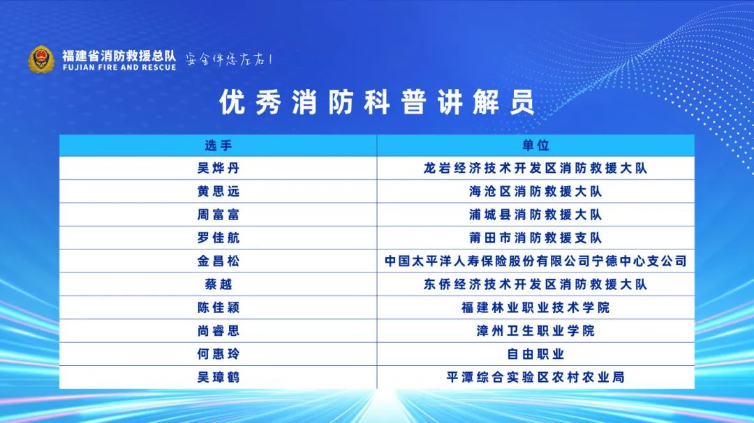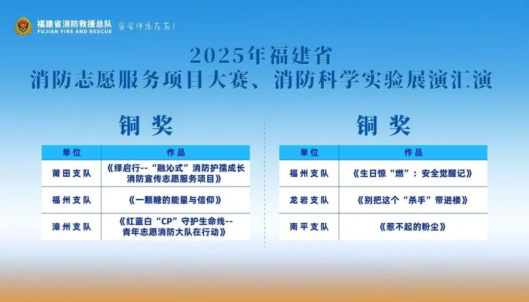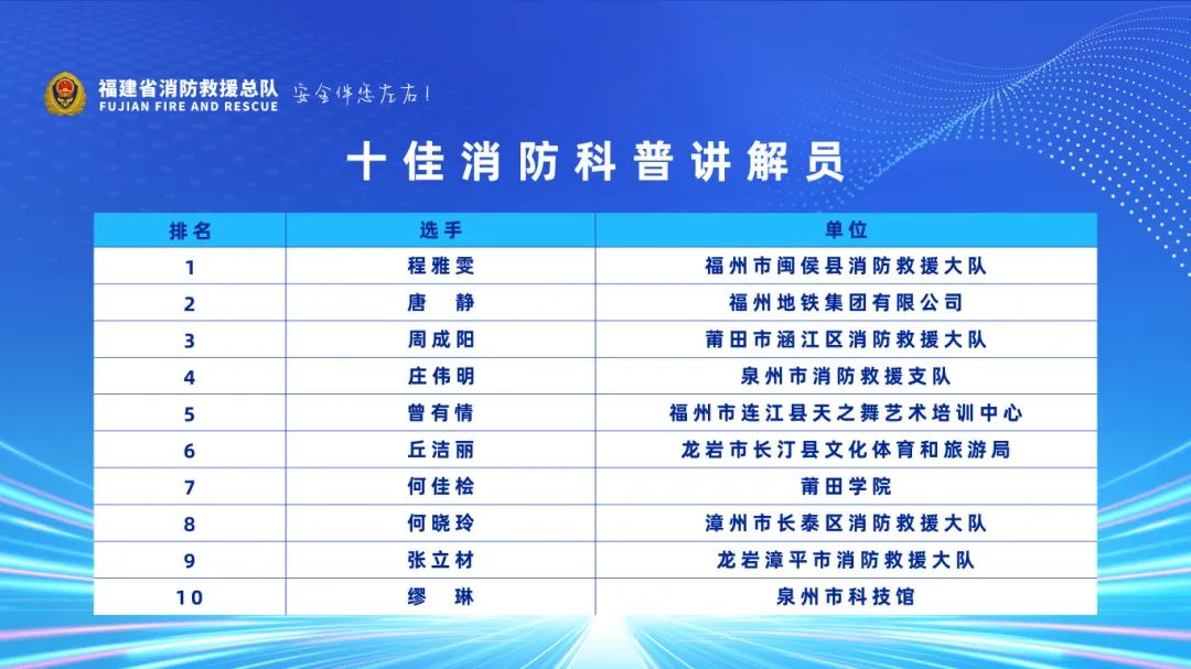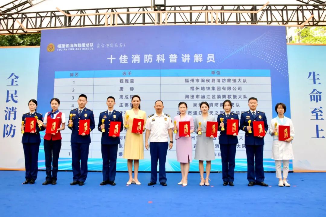 经过激烈角逐,10名同志获评大赛“十佳消防科普讲解员”、10名同志获评大赛“优秀消防科普讲解员”,消防志愿服务项目大赛、消防科学实验展演汇演分别评出项目金奖1个、银奖2个、铜奖3个。