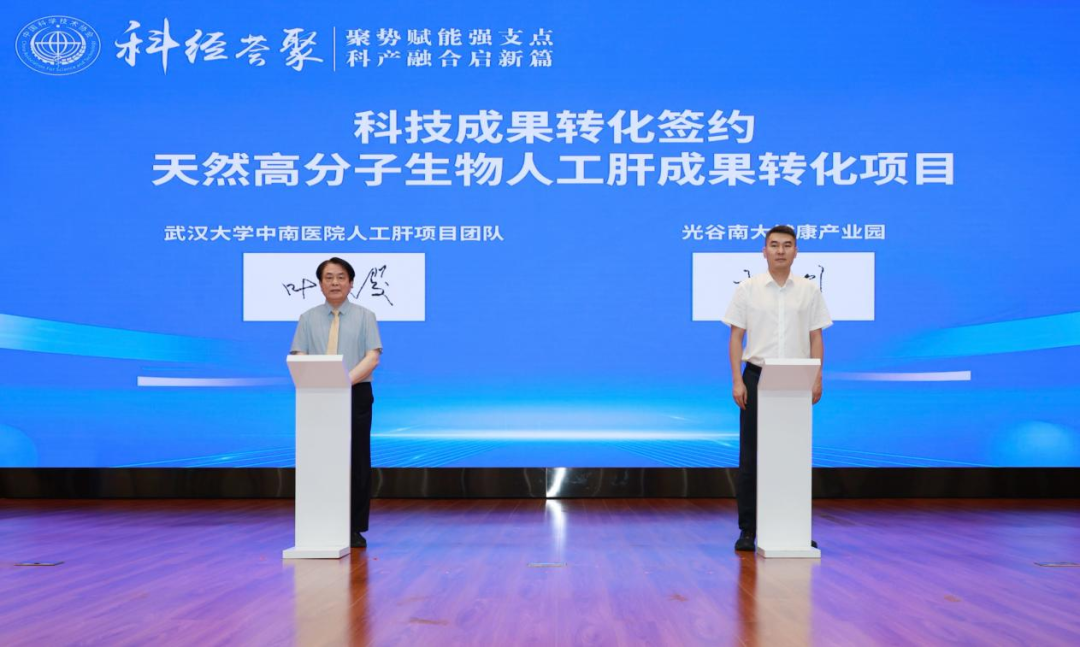 科技成果转化签约环节,武汉大学肝胆疾病研究院院长叶啟发教授、武汉纺织大学材料学院副院长刘欣,分别就《天然高分子生物人工肝成果转化项目》《医用防辐射新型材料项目》做宣介,并与江夏区大健康产业园进行科技成果转化签约,形成初步合作意向。两个项目经过前期商洽沟通,均有望落地江夏区。