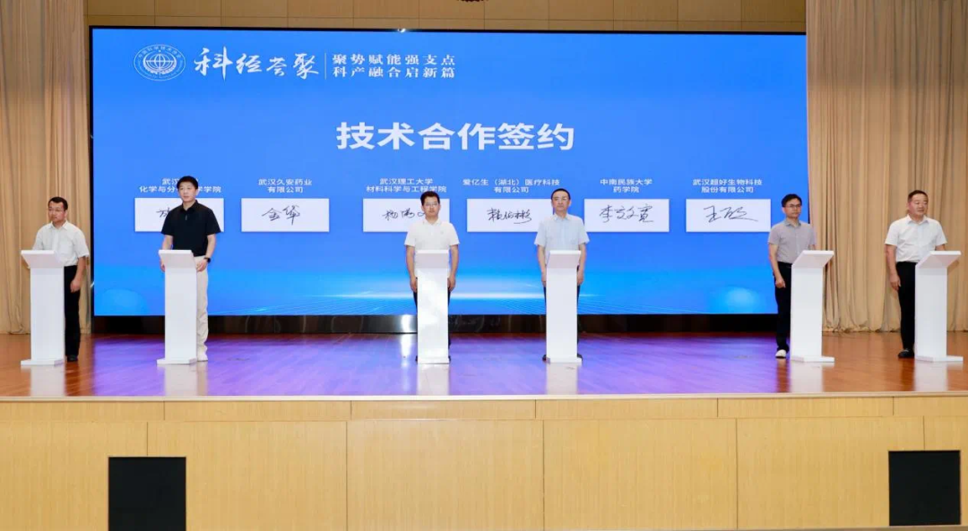 技术合作签约环节,武汉大学化学与分子科学学院、武汉理工大学材料科学与工程学院、中南民族大学药学院等专家团队,分别与武汉久安药业有限公司、爱亿生(湖北)医疗科技有限公司、武汉超好生物科技股份有限公司成功签署技术合作协议,形成一批合作意向和成果。