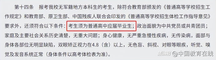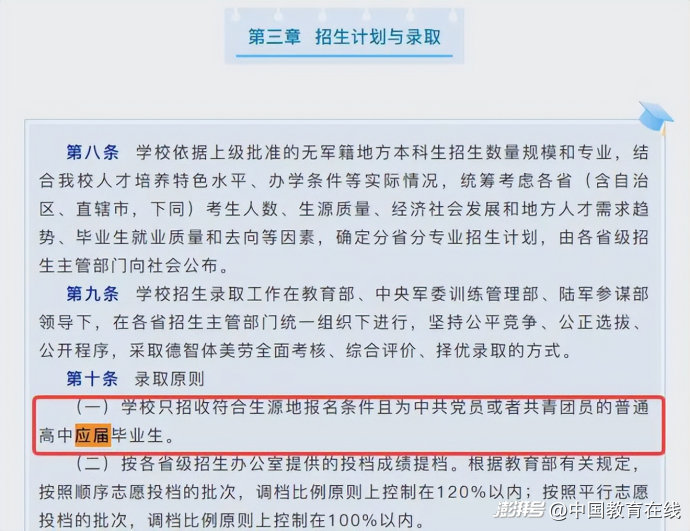 陆军军医大学(第三军医大学)2025年无军籍地方本科生招生章程明确:学校只招收符合生源地报名条件且为中共党员或者共青团员的普通高中应届毕业生。