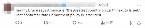 “塔米·布鲁斯说美国是‘地球上仅次于以色列的最伟大国家’,这证实了国务院的政策是以色列优先。”