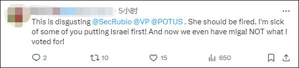 有网民@美国总统特朗普、美国副总统万斯和美国国务卿鲁比奥,并写道:“这太恶心了。她应该被解雇。我受够了你们中有些人把以色列放在第一位!现在我们甚至有了MIGA(让以色列再次伟大)!这不是我投票支持的!”