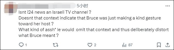 有网民则替布鲁斯辩护称:“i24 news不是以色列的电视频道吗?这段上下文语境难道不是表明布鲁斯只是在向主持人示好吗?究竟是什么样的混蛋会省略上下文,从而故意歪曲布鲁斯的意思?”