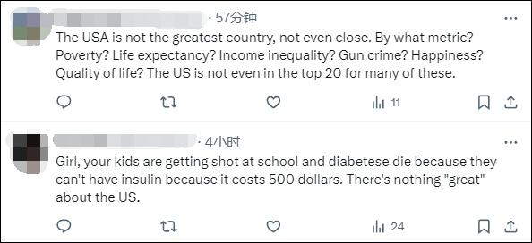 “女孩,你的孩子在学校遭遇枪击,糖尿病患者由于打不到500美元(约合人民币3600元)的胰岛素而死亡。美国没有什么“伟大”之处。”