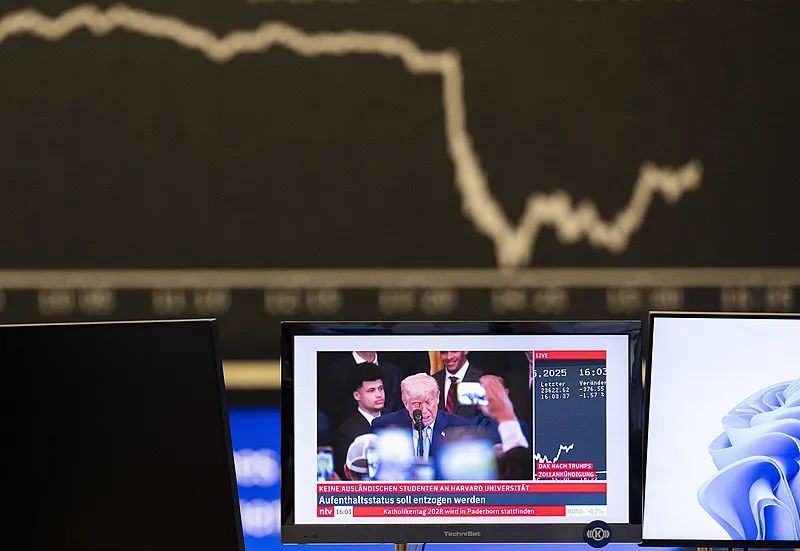 当地时间5月23日,德国黑森州法兰克福,屏幕上显示美国总统特朗普的画面。特朗普宣布对欧盟商品征收巨额关税后,德国主要股指DAX大幅下跌。 视觉中国