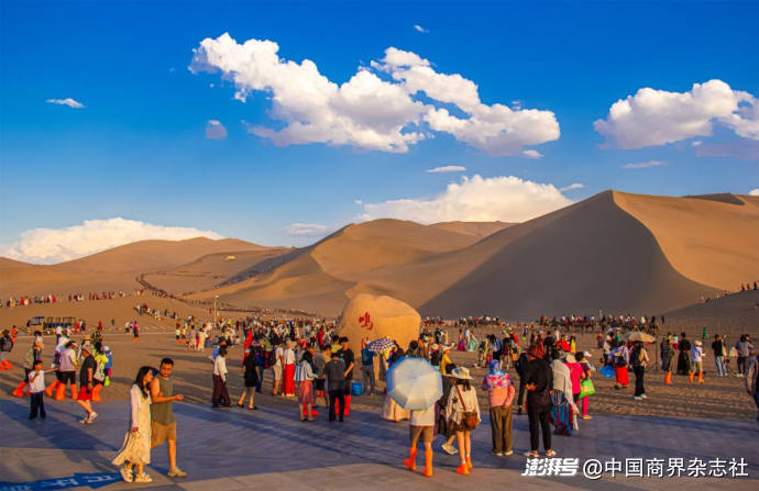 图为在甘肃省敦煌市鸣沙山月牙泉景区,壮美的大漠风光吸引众多游客。(图片由CNSPHOTO提供)