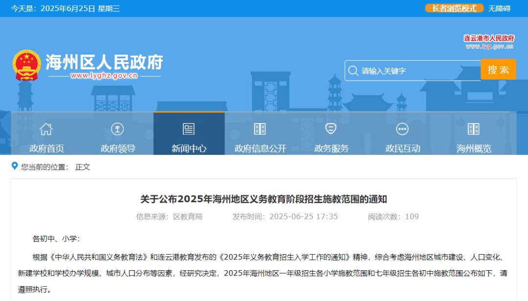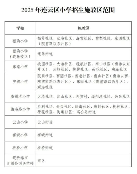 各初中、小学:根据《中华人民共和国义务教育法》和连云港教育发布的《2025年义务教育招生入学工作的通知》精神,综合考虑海州地区城市建设、人口变化、新建学校和学校办学规模、城市人口分布等因素,经研究决定,2025年海州地区一年级招生各小学施教范围和七年级招生各初中施教范围公布如下,请遵照执行。