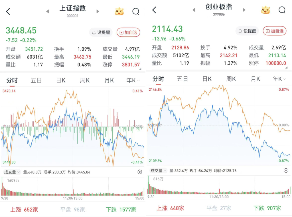 至收盘,上证综指跌0.22%,报3448.45点;科创50指数跌0.57%,报989.97点;深证成指跌0.48%,报10343.48点;创业板指跌0.66%,报2114.43点。
